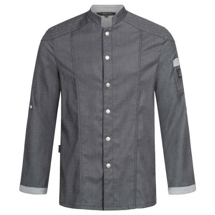 Sie wollen in der Küche auch optisch glänzen, dann ist diese anthrazitfarbene Kochjacke in denimoptik perfekt - Gleichzeitig ist die Jacke praktisch und pflegeleicht.