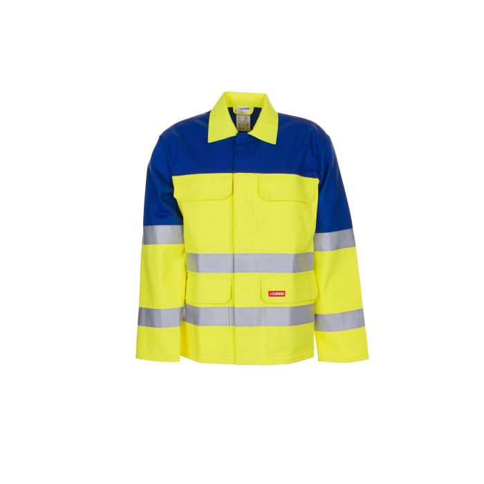 Hergestellt aus 64 % Baumwolle, 35 % Polyester und 1 % Carbonfasern, bietet die Jacke antistatische und flammhemmende Eigenschaften sowie eine Fluorcarbon-Ausrüstung. Das Reflexband in Silber garantiert zusätzliche Sichtbarkeit.